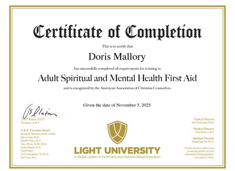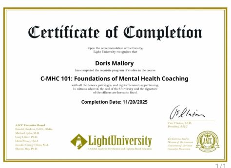 Doris Mallory is certified through Light University, bringing a professional foundation to her coaching practice. While she has been guiding clients since 2017, she became a licensed coach just over a year ago, combining years of hands-on experience with formal training to provide impactful, faith-based life coaching.